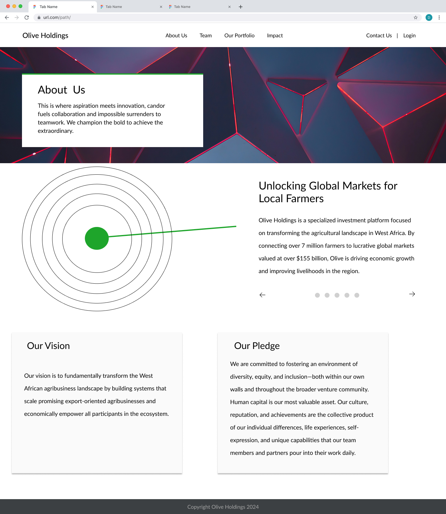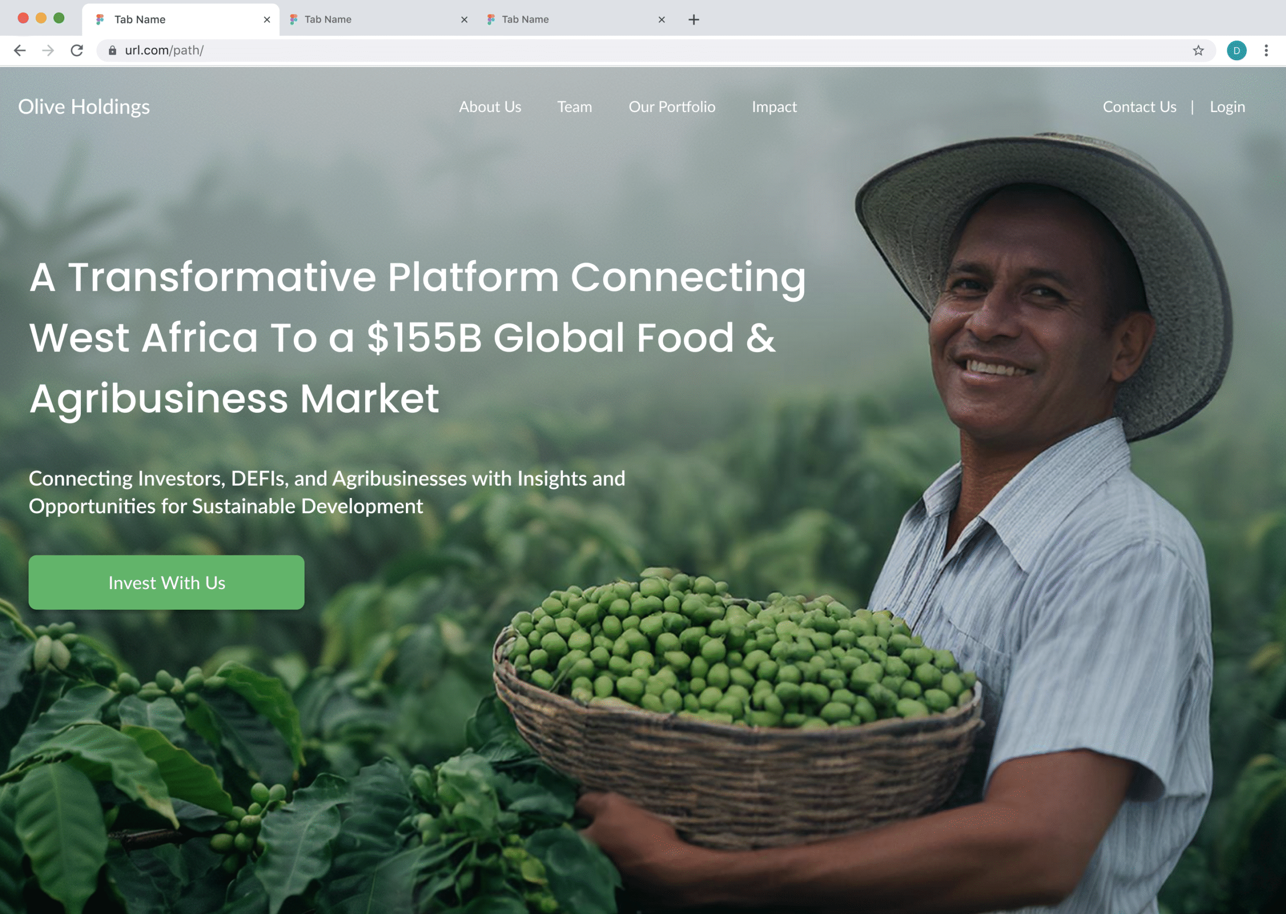 I designed the landing page for Olive Holdings, an investment company focused on connecting West Africa’s agribusiness sector to global markets. The goal was to build a professional, trustworthy, and modern web presence that appealed to both investors and agribusiness stakeholders.